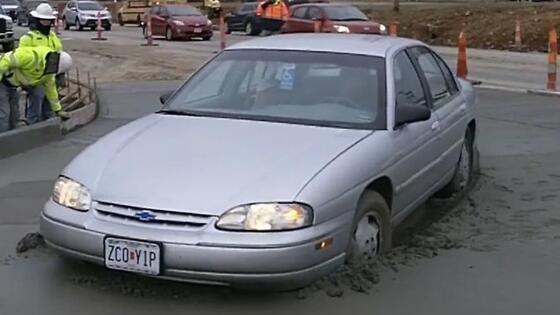 Дорожные работы, проводившиеся 26 февраля в черте города Озарк (округ Кристиан Каунти, штат Миссури, США) пришлось экстренно приостановить по вине рассеянного автовладельца, раньше времени заехавшего на ремонтируемую дорогу. Автовладельцу повезло и его транспортное средство заехало в мокрый, не успевший затвердеть бетон. Спустя некоторое время застрявший седан при помощи эвакуатора был отбуксирован с места проведения дорожных работ. Один из сотрудников организации-подрядчика запечатлел необычный инцидент.