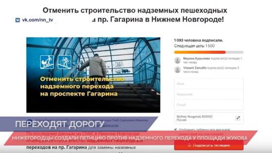 Петиция за отмену строительства надземных переходов на проспекте Гагарина в Нижнем Новгороде появилась в конце февраля. Количество подписавшихся уже перевалило за тысячу и число это растет с каждым часом. Создатель петиции Артем Белов считает, надземные переходы не решают проблему безопасности. Многие предпочтут все равно идти через дорогу на свой страх и риск. В час по «зебре» у остановки «Площадь Жукова» проходят до 350 человек. Согласно данным администрации, жители неоднократно жаловались на опасность этого участка дороги. Надземный переход должен решить эту проблему, считают в мэрии. Автоэксперты говорят: проспект Гагарина — одна из двух основных и самых загруженных магистралей города. Только на обсуждаемом отрезке дороги у остановки «Площадь Жукова» в час проезжают до четырех тысяч автомобилей. Отказ от привычных «зебр» в пользу надземных переходов поможет снизить автомобильную нагрузку. Транспортные потоки на проспекте Гагарина разделили в районе Университетского городка еще в 2012 году. Деньги действительно немалые. На постройку надземного перехода около Университетского городка ушло 66 млн рублей. Но следят ли за дорогой конструкцией? Около года назад наша съемочная группа уже проверяла работоспособность электроподъемника для маломобильных граждан в этом переходе. Тогда в администрации объяснили, виной всему проблемы с электроникой. Спустя год подъемник по-прежнему закован в цепи, кнопка вызова диспетчера — не нажимается, а в администрации все еще обещают провести ремонт. Правда, причина поломки теперь называется другая. Непростая судьба и у пешеходного наследия чемпионата мира — надземного перехода на улице Бетанкура. Его открыли в 2018 году, а регулируемый наземный переход закрыли после нескольких смертельных аварий. Установили несколько электроподъемников. Однако в августе прошлого года мэрия заявила, механизм необходимо доработать, как и условия подъема детских колясок и наземный переход вновь открыли с оговоркой — мера временная. Прошло полгода — пешеходы все еще пользуются зеброй. А оборудование также не работает. Многие опрошенные нами горожане считают: причина плачевного состояния оборудования — безответственность руководства и обслуживающих организаций. Между тем на ставший сейчас спорным надземный переход около остановки «Площадь Жукова» в Гордуме решили выделить почти 6 млн рублей — и это только на разработку проекта. Техническое задание должно предусматривать оснащение перехода лифтами для маломобильных граждан.