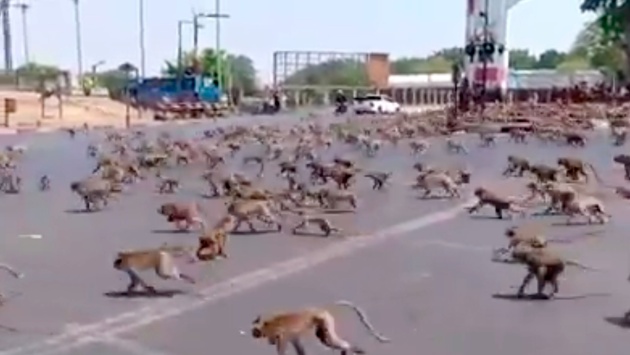Дорожное движение не смутило агрессивно настроенных животных, живущих по обе стороны от дороги. В таиландском городе Лопбури бесчисленная группа обезьян решила выяснить отношения прямо на проезжей части, не взирая на дорожное движение. В городе находится два больших поселения обезьян: одно находится на территории двух храмов - Пра Пранг Сам Йот и небольшого соседнего действующего индуистского храма. Разделяющая храмы дорога обезьян не смущает, и они постоянно бегают из стороны в сторону, выясняя отношения. На кадрах ролика, опубликованного в Facebook, видно, насколько много обезьян одновременно выбегают на проезжую часть. В один из моментов, после небольшой стычки, разбегаясь, животные буквально заполонили весь перекресток.