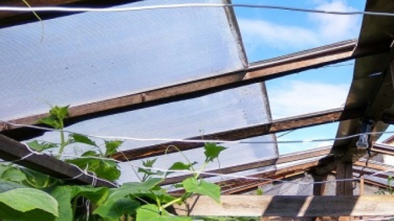 В 2009-2010 годах построили две теплицы 6 и 8 м длинной из оконных рам. Крышу просто накрыли поликарбонатом (ПК), прикрутив его планками к стропилам. Так было ПК по рёбрам уже стал растрескиваться, и возникла необходимость в его замене. В этом году, в ходе дискуссии, было высказано пожелание, что неплохо было бы, чтобы крыша раздвигалась. Посмотрела ролик про теплицу «Воля», ничего не поняла, поняла только, что станка у нас нет, чтобы ПК вставить в алюминиевую раму, и мы «пошли другим путём». Сделали облегчённый вариант — на стропила прикрутили саморезами планки, а между ними проложили кабель-каналы 10х15, и получился Н-образный профиль, и по этим направляющим задвигаются листы ПК. Торцы ПК загерметизировала (нудно, но решила, что надо) и надела торцевой профиль для жесткости. Для одной теплицы листы ПК порезали пополам по 105 см, а для другой — на три части по 70 см — лучше по 70 см, они не прогибаются. Так стало На зиму будем снимать и убирать. Теперь сдвигаю несколько листов ПК — и нет сильной жары, а то в 40 см от крыши было +64ºC. Света больше стало. Вид изнутри Всегда рада конструктивной критике, может быть, что-то не учла.