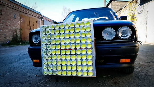Отечественные умельцы объявили войну темноте и сделали фару-монстр. Это король всех фар и ядерная ударная батарея против любого сумрака.Мастера соединили сотню светодиодов в яркий прожектор мощностью 10 кВт. Сказать, что он светит ярко — ничего не сказать. Те, кто находится по другую сторону экрана испытывают трепет, резь в глазах и чувство глубокого сочувствия по отношению к тем, кто вдруг окажется на пути автомобиля с подобной головной оптика. Кстати, суперфара установлена на необычный BMW 3 серии E30 – это электромобиль с самодельной силовой установкой.