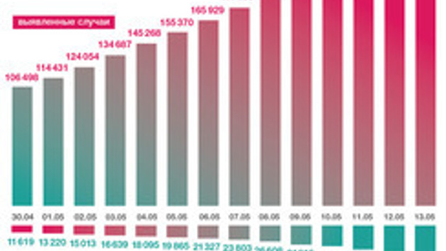 В России коронавирус за сутки подтвердился ещё у 10 028 человек в 83 регионах. Об этом сообщает информационный центр по мониторингу ситуации с инфекцией в среду, 13 мая. Распределение по субъектам: 1. Москва — 4 703; 2. Московская область — 962; 3. Санкт-Петербург — 435; 4. Нижегородская область — 271; 5. Свердловская область — 135; 6. Волгоградская область — 124; 7. Республика Дагестан — 109; 8. Рязанская область — 97; 9. Смоленская область — 97; 10. Краснодарский край — 96; 11. Калужская область — 94; 12. Красноярский край — 93; 13. Белгородская область — 90; 14. Тульская область — 89; 15. Ярославская область — 88; 16. Ростовская область — 87; 17. Республика Татарстан — 87; 18. Тамбовская область — 85; 19. Саратовская область — 85; 20. Самарская область — 79; 21. Республика Северная Осетия — 78; 22. Чувашская Республика — 78; 23. Тюменская область — 75; 24. Кабардино-Балкарская Республика — 74; 25. Новосибирская область — 74; 26. Брянская область — 73; 27. Владимирская область — 72; 28. Курская область — 67; 29. Ленинградская область — 66; 30. Орловская область — 59; 31. Приморский край — 53; 32. Ставропольский край — 51; 33. Челябинская область — 51; 34. Оренбургская область — 50; 35. Республика Башкортостан — 49; 36. Ямало-Ненецкий АО — 49; 37. Пермский край — 48; 38. Липецкая область — 46; 39. Ульяновская область — 46; 40. Республика Саха (Якутия) — 46; 41. Хабаровский край — 46; 42. Астраханская область — 44; 43. Мурманская область — 43; 44. Республика Ингушетия — 43; 45. Ханты-Мансийский АО — 43; 46. Алтайский край — 43; 47. Пензенская область — 42; 48. Воронежская область — 40; 49. Калининградская область — 40; 50. Республика Мордовия — 37; 51. Республика Калмыкия — 35; 52. Республика Марий Эл — 32; 53. Чеченская Республика — 28; 54. Республика Бурятия — 28; 55. Еврейская АО — 24; 56. Омская область — 23; 57. Забайкальский край — 22; 58. Республика Хакасия — 21; 59. Кировская область — 20; 60. Иркутская область — 20; 61. Камчатский край — 20; 62. Архангельская область — 19; 63. Республика Адыгея — 19; 64. Костромская область — 18; 65. Вологодская область — 17; 66. Томская область — 17; 67. Новгородская область — 14; 68. Республика Тыва — 13; 69. Амурская область — 13; 70. Республика Коми — 12; 71. Карачаево-Черкесская Республика — 12; 72. Псковская область — 11; 73. Ивановская область — 10; 74. Тверская область — 10; 75. Кемеровская область — 9; 76. Республика Крым — 7; 77. Республика Карелия — 5; 78. Магаданская область — 5; 79. Республика Алтай — 4; 80. Чукотский АО — 4; 81. Курганская область — 2; 82. Сахалинская область — 1; 83. г. Севастополь — 1. Всего за период пандемии зарегистрирован 242 271 случай коронавирусной инфекции в 85 регионах. Скончались 2 212 пациентов (+96). За последние сутки выписано 4 491 человек. Россия заняла третье место в мире по числу заразившихся коронавирусом.