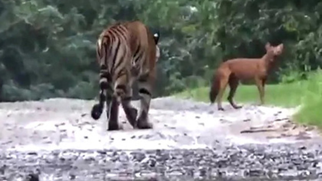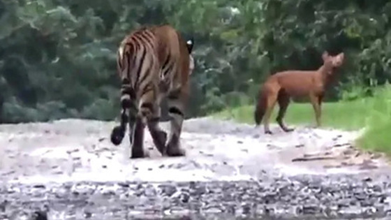 Погоня тигра за вопящим красным волком попала на видео