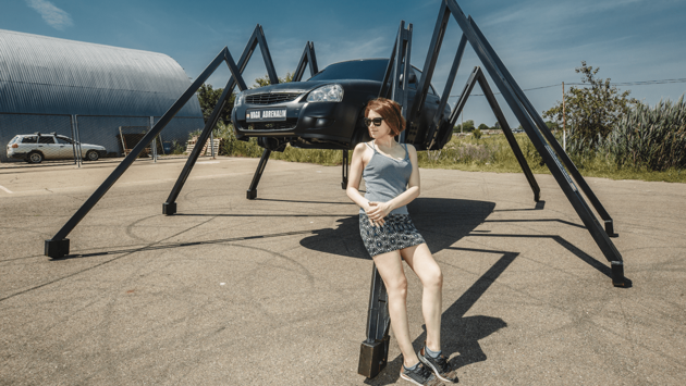 Фото: Денис Яковлев, «КИ» Паучья душа «приоры»: Краснодарский умелец превратил машину в насекомое «Девятка» дальнего плавания В автомобильных кругах 28-летний изобретатель известен как Вага Адреналин. Прозвище парень получил не случайно: в поисках ярких эмоций он перепробовал всевозможные экстремальные виды спорта. А год назад Вага нашел новое хобби. Он выкупает старые автомобили и вместе с командой единомышленников модернизирует их в нечто необыкновенное. Первый мой проект — плавающая «девятка», — вспоминает Вага Адреналин. — Мы приварили на колеса лопасти, установили под машину специальные подушки и кинули ее в Кубань. Эксперимент не удался: машина печально булькнула и тут же утонула. Но Вага и его команда не отчаивались. С помощью манипулятора они извлекли несчастную «девятку» со дна и провели работу над ошибками. Вторая попытка спуска «корабля» на воду состоялась на маленьком озере в Адыгее. В этот раз она не завалилась набок, а поплыла, как настоящий катамаран! Мы рассекали по озеру минут 20, пока бензин не закончился. Недолго музыка играла: после успешно пройденного испытания «девятку» извлекли из воды и отослали на покой в гараж. Отправиться в дальнее плавание ей было не суждено. Она уже заржавела за год. Теоретически на ней еще можно покататься, но мне не хочется, поскольку я потерял интерес. Я не стремлюсь переделать автомобиль в другой полезный агрегат, я просто хочу развлечься. И история водоплавающей «девятки» на этом заканчивается. Гонка кверху пузом Следующим проектом Ваги стала приора-колесница — та самая машина, которую позже превратили в огромного механического паука. Вместо стандартных шин Вага поставил на автомобиль большие колеса из металлоконструкций. Она могла даже кверху пузом ездить, — хвастается изобретатель. — Это крайне неудобно, но выглядит эффектно. Когда мы привезли колесницу на площадь перед театром драмы, собрали вокруг себя огромную толпу зевак. Прохожие, бегущие по своим делам, останавливались, подходили ближе и просили сфотографироваться или посидеть внутри. Правда, сотрудники полиции наших восторгов не разделили и оштрафовали за изменение конструкции на 500 рублей. Вдоволь наигравшись с колесницей, Вага решил, что огромными колесами уже никого не впечатлить, поэтому пора «переобувать» тачку. Идею трансформировать «приору» в паука подкинул Ваге его подписчик в соцсетях. Вместе с другом мы ежедневно работали над новой задумкой в течение двух месяцев. Преображение «лады» обошлось нам в 300 тысяч рублей. К обрезанным колесным дискам ребята приварили восемь лап шириной в шесть метров, а по центру машины к дополнительным усилителям поставили двойные стальные профили. Вместо двигателя Вага установил несколько электромоторов, которые приводят в движение ноги. К сожалению, топать стальными лапами, как настоящий паук, «приора» не способна, но вполне может передвигаться своим ходом. Правда, очень медленно — не более 5 км/ч. Мы попросили Вагу прокатиться. Оседлать зверя получилось только у нашего фотографа: чтобы забраться в салон паука, нужно приложить немало усилий. Монстр медленно нарезал круги по полигону, а издалека казалось, что эпоха киберпанка уже наступила. Кататься на подобных изобретениях по дорогам запрещено, так что паук останется доживать свой век здесь, за городом. Разбирать м