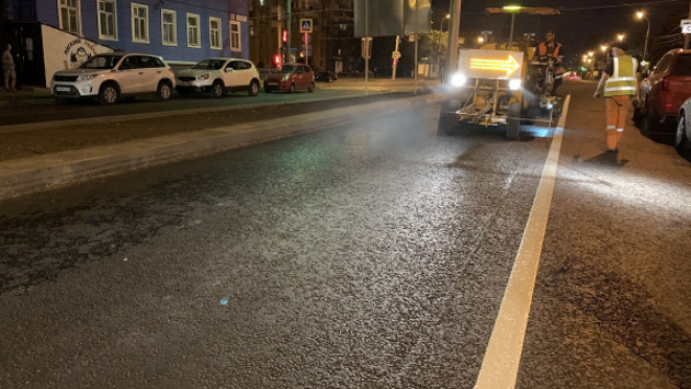 Рабочие наносят дорожную разметку на улице Ленинской в Самаре