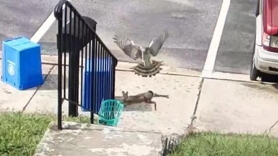 Камера наружного наблюдения, установленная на жилом доме в небольшом населённом пункте в США, на днях запечатлела неудачную охоту пернатого хищника на зайца. Лопоухий дикий зверь оказался проворнее ястреба и успел скрыться от него под автомобилем, припаркованным возле дома. Со слов автора видеоролика, его жена, оставившая под лестницей пластиковую корзину, тем самым спасла жизнь зайцу, который сначала угодил в неё, а затем сбил с толку пернатого хищника, спрятавшись под легковушкой.