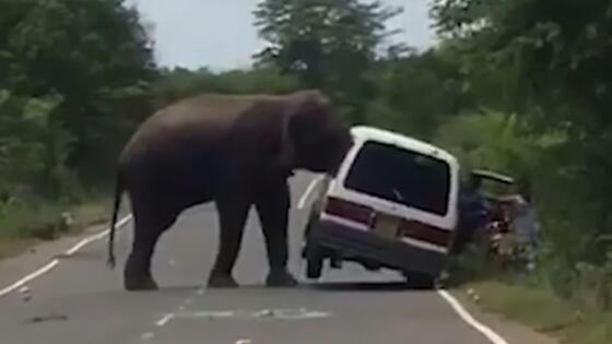 Члены многочисленного семейства, проезжающие 11 августа на микроавтобусе через территорию заповедника в Катагамуве (город Буттала, Монарагальский район, провинция Ува, Шри-Ланка), имели неосторожность покормить хлебом перегородившего дорогу слона. Дикий зверь не стал довольствоваться малым и засунув хобот в открытое окно транспортного средства, вынудил всех людей покинуть салон. В какой-то момент слон чуть не завалил фургон на бок, но пассажирам криками удалось вразумить животное не делать этого. Один из участников дорожного движения запечатлел противостояние с диким зверем. Со слов автора видео, приехавшие позже представители лесного управления отогнали слона от машины и позволили всем членам семейства уехать из заповедника. Шри-ланкийский слон - это исчезающий вид, охраняемый в соответствии с законодательством страны. В данный момент численность животных составляет около 3000 особей.