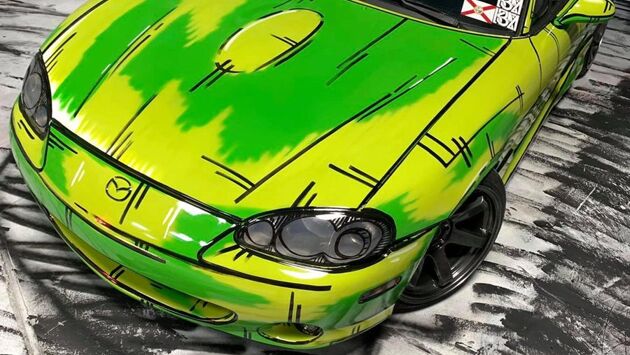 Художник-граффитист Кайл Брайс Монтейро, известный под псевдонимом «KBMER», уже неоднократно необычным образом раскрашивал автомобили. Его последней работой стала покраска собственного родстера Mazda MX-5. Он использовал комбинацию аэрозольной краски и маркеров Montana Cans. Но перед этим кузов был перекрашен в ярко-зеленый цвет из предыдущего сине-черного. Художник поставил перед собой задачу превратить родстер в героя комиксов. И это у него, кажется, прекрасно получилось. Яркие однотонные цвета и контурные линии делают своё дело. Этот MX-5 — автомобиль второго поколения, производство которого продолжалось до 2005 года. Его классические линии стали идеальной отправной точкой создания проекта в стиле японской манги. В итоге теперь MX-5 притягивает взгляд и кажется, будто он движется, даже когда стоит на месте. Автомобиль художника, похоже, не является стоковым, так как он оснащен заниженной подвеской и кастомными колесами большего размера. У него также есть фиолетовая подсветка днища. По словам художника, на то, чтобы раскрасить MX-5 у него ушло всего пара часов.