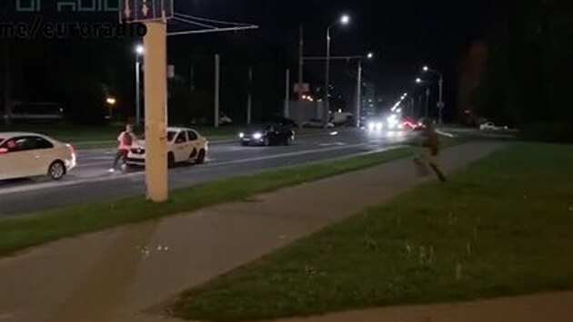 Видеозапись опубликовало Euroradio в своем Telegram-канале. На кадрах видно, как мужчина убегает от правоохранителей. В это время на перекрестке стоят несколько машин, ожидая зеленый сигнал светофора. Протестующий выбегает на дорогу и запрыгивает в автомобиль такси. Силовики также подбегают к машине и пытаются задержать ее, при этом бьют по капоту. Однако таксист резко стартует, выезжая на встречную полосу на красный сигнал светофора, и скрывается. 23 сентября в Минске начались акции протеста в связи с инаугурацией президента Александра Лукашенко. Протестующих начали разгонять водометами и светошумовыми гранатами. Белорусская милиция опровергла такие методы при разгоне демонстрантов. Инаугурация Лукашенко состоялась во Дворце независимости в Минске 23 сентября. Церемонию не транслировали телеканалы, власти до последнего скрывали ее дату. Несколько стран, в том числе США и Украина, не признали его легитимным президентом. По данным ЦИК, Лукашенко выиграл президентские выборы 9 августа, набрав 80 процентов голосов. В Белоруссии седьмую неделю проходят массовые протесты граждан, не согласных с официальными результатами голосования.