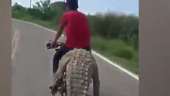 Мужчина прокатился верхом на привязанном к мотоциклу крокодиле и попал на видео