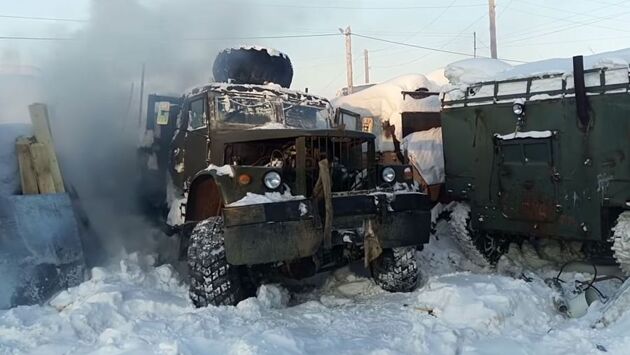 КрАЗ-255, который вы видите в этом видеоролике, уже отбегал своё и последние несколько лет стоял без дела прямо на улице. Естественно, его никто даже не пытался заводить или перемещать с места на место. В один прекрасный момент стало понятно, что грузовик больше на дороги не вернется, а место он занимает довольно много. Тогда было решено разобрать его на запчасти, чтобы он стал донором для других, более живых КрАЗов. Но как перетащить его поближе к ремонтному боксу? Решили попробовать собственным ходом. Вот только завести технику, простоявшую несколько лет без движения, когда на улице -30 °C — это не самая простая задача. Сначала мотор отогревали пушкой, потом горячей водой пролили через блок двигателя, с помощью ведра и лейки. И вот он ожил. А потом даже смог самостоятельно выехать с места многолетней стоянки. Обратите внимание, что радиатор был снят ранее, и грузовик путь до бокса проделал без него.