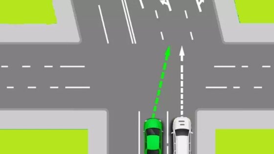Водители зелёного и белого автомобилей решили на перекрестке перестроиться в одну и ту же полосу. Какой автомобиль имеет право проехать первым?