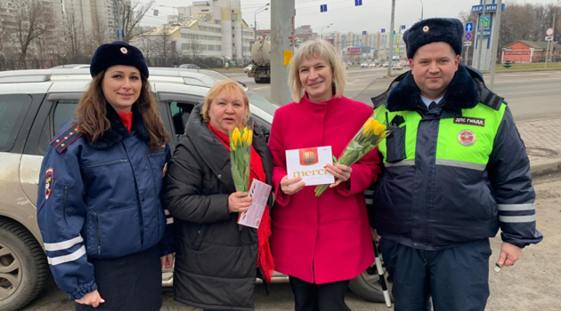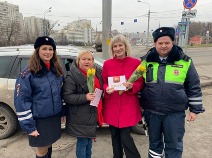 Автоледи получили цветы и конфеты от сотрудников ДПС на одном из перекрестков Люблинской улицы
