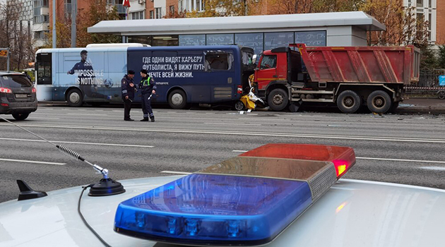 В центре Москвы автомобиль такси смяло после удара грузовика