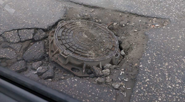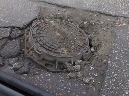 На улице Блинова в Саратове увяз в разбитом асфальте канализационный колодец