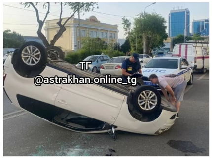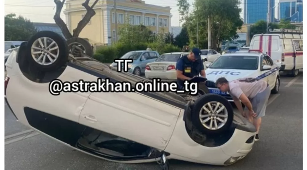 В Астрахани автоледи за рулем Volkswagen Polo врезалась в припаркованную Hyundai и перевернулась