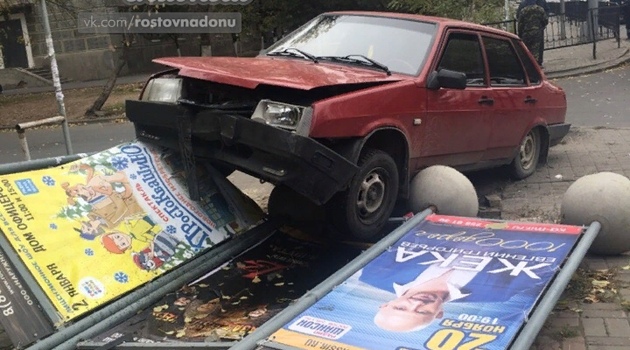 В центре Ростова легковушка снесла рекламный щит