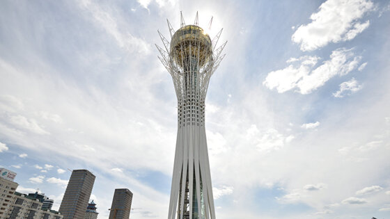 АСТАНА, 29 мая — Sputnik. В Астане завершается капитальный ремонт главного символа столицы – монумента "Байтерек": идут отделочные работы, строители планируют завершить их в срок – до начала выставки ЭКСПО, которая стартует 10 июня, сообщается на сайте акима столицы. Ремонт главного архитектурного символа Казахстана идет с начала года. За почти 20 лет без серьезного ремонта монумент немного утерял эстетический вид. В рамках капитального ремонта монумент заново покрасили, правда, цветовая гамма осталась прежней – белый и золотой. Кроме того, заменены треснувшие старые стеклопакеты купола и ствола монумента. Изготовленные по итальянской технологии стеклянные витражи должны прослужить долго и выдержать все особенности астанинского климата — аномальные морозы и шквалистый столичный ветер. Были заменены 18 стеклопакетов, проведен комплекс работ по замене стеклопакетов ствола лифтовой шахты. Установлен двойной стеклопакет с энергосбережением, чтобы уменьшить затраты и потери тепла. Кроме того, использовался специальный структурный силиконовый герметик, который работает в широком диапазоне температур, чтобы стекло в дальнейшем не трескалось. Также проведен комплекс работ по зачистке этих швов. Внутри монумента восстановили и заменили систему вентиляции, кондиционирования и сантехнику. В ремонтных работах задействовано около ста человек. Монумент "Байтерек" возводился по идее президента Казахстана Нурсултана Назарбаева и проекту архитектора Акмурзы Рустембекова. Строительства символа новой столицы Казахстана заняло шесть лет — с 1996 по 2002 годы. Высота сооружения составляет 97 метров. "Байтерек" расположен в новом административном центре на Левом берегу города. Идея монумента пришла из тюркских легенд. Байтерек, согласно мифическим преданиям, это древо жизни, соединяющее землю и небо. На дереве птица Самрук откладывает золотое яйцо.