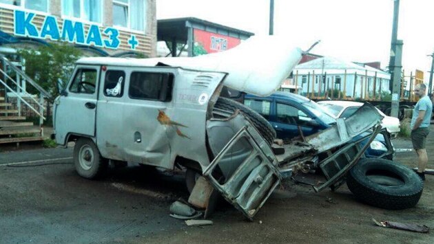 Два человека чудом не пострадали при взрыве колеса от грузовика, в результате которого вывернуло наизнанку кузов УАЗа. Телеканал «360» публикует запись с камеры наблюдения. Инцидент произошел около 10:00 в минувшую среду, 19 июля, на стоянке перед магазином, где «буханка» остановилась после посещения автосервиса. «Колесо было не очень хорошего качества, мы его, вроде, отремонтировали, накачали. Они загрузили к себе в машину, от нас отъехали, через три минуты оно у них взорвалось внутри», — рассказал БСТ сотрудник сервиса. Взрывной волной кузов УАЗа буквально вывернуло наружу, а само колесо отбросило на пару десятков метров. Оглушенные водитель и слесарь в результате инцидента не пострадали.