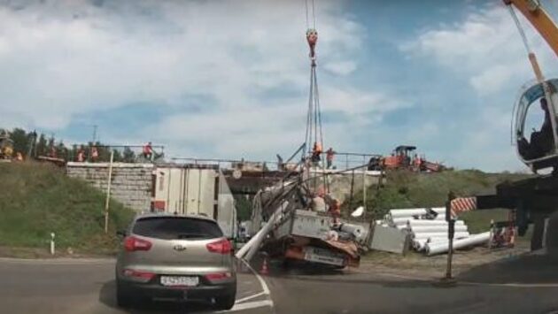 На видео попали последствия столкновения грузовика с опорой моста в Нарышкино