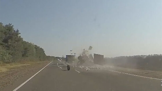 На трассе на Кубани грузовик с клетками, в которых были десятки живых кур, занесло, из-за чего один из прицепов перевернулся и покатился по дороге. Птицы начали сыпаться на дорогу, как в популярной игре Angry Birds. Отмечается, что большинство из них пострадали. ЧП произошло на трассе в Новопокровском районе Краснодарского края и попало на видеорегистратор следовавшей за грузовиком легковушки. Ролик появился в Сети 11 сентября, несмотря на то, что дата на регистраторе сбита и видео датировано 2015 годом. На нем видно, что корпус прицепа полностью рассыпался, а колеса отлетели на обочину. Водитель и пассажир не пострадали. В МВД РФ рассказали сайту телеканала Звезда , что в ведомство не поступало сообщений о ДТП в этом районе.