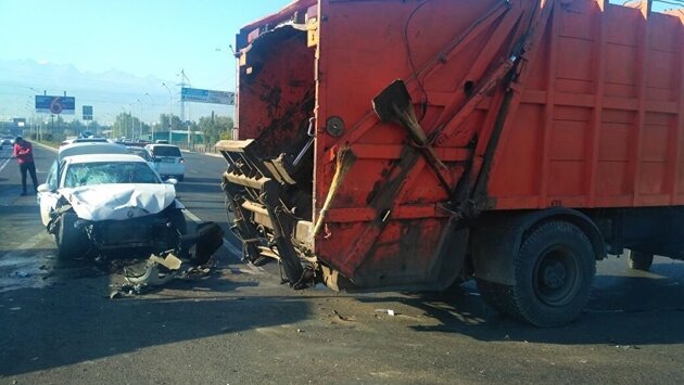 BMW врезался в мусоровоз в Алматы, есть пострадавшие