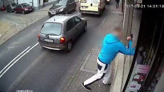 На кадрах молодой мужчина в дневное время разбивает витрину магазина, прохожий делает ему замечание, в ответ сталкивается с агрессией и отступает. Злоумышленник продолжает выламывать стекло, а прохожий куда-то звонит с мобильного телефона. Заметив это, вандал бросается бежать и, перебегая дорогу, попадает под автомобиль. Постепенно собираются свидетели происшествия, однако в итоге на месте ЧП остается лишь тот самый случайный прохожий, который звонит по телефону, пытаясь, очевидно, вызвать скорую, и лежащий на земле пострадавший. Подробности инцидента приводит Dziennik Zachodni