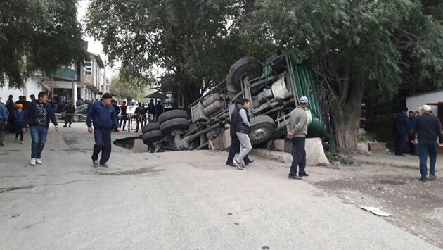 В Кыргызстане грузовик с углем провалился под землю — шокирующие кадры