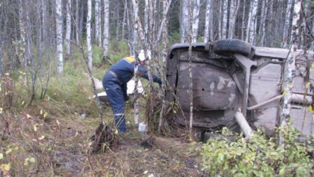 Из-за лопнувшей покрышки на трассе в Коми автомобиль кировчан улетел в кювет