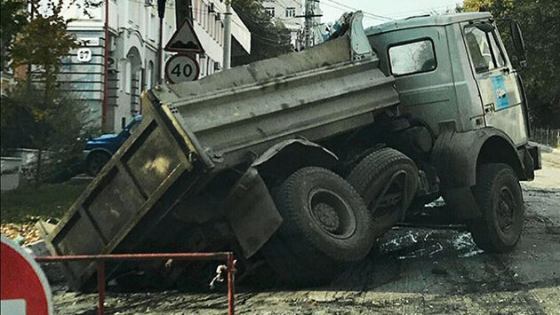 Опубликовано видео с самосвалом МАЗ, который ушел под асфальт в центре Хабаровска. На пересечении улицы Комсомольской и Амурского бульвара в Хабаровске во время укладки асфальта самосвал МАЗ едва полностью не ушел под землю. Под весом тяжелой машины ремонтируемый участок дороги просел и МАЗ провалился по кузов в образовавшуюся под ним яму. Об этом сообщает местное информационное агентство Амурпресс. По информации источника, в этом районе под землей проходит речка и после долгих дождей образовались промоины, в одну из которых и угодил тяжелый самосвал МАЗ. В настоящее время машину уже вытащили, дыру в асфальте заделали. Движение по отремонтированному участку открыто.