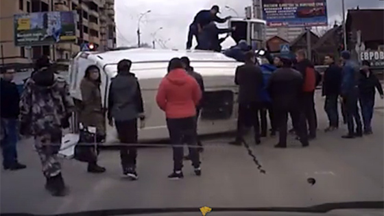 Скорая помощь с включенным проблесковым маячками двигалась по улице Кирова, когда в ее заднюю часть врезался автомобиль Mitsubishi Delica. От удара «скорую» отбросило, она перевернулась и с силой упала набок на проезжей части. Все произошло мгновенно. Момент аварии попал на видео, которое выложили в Сеть. «Судя по записи, водитель скорой помощи двигался со включенным проблесковым маячком и звуковым сигналом по Кирова. Водитель Delica двигался по Дунайской и не успел среагировать на появление «скорой», так как не увидел ее из-за кроссовера Lexus, поворачивающего налево», – сообщается на странице Новосибирского «АСТ-54». Уже через несколько секунд первые очевидцы стали подбегать к «скорой», заглядывать внутрь, открыть возможные двери. Среди них – и мужчины, и женщины. Сначала из кареты «скорой» выбрался медицинский сотрудник, затем – водитель. К счастью, они не пострадали. Затем мужчины поставили «скорую» на землю. Это удалось им не сразу, пришлось приложить усилия. Стоит отметить, что действовали они слаженно, без промедления и разногласий, чем поразили пользователей соцсетей. «Респект очевидцам!», «Мужики!», «Приятно наблюдать, что люди мимо не проходят! Все на помощь пришли!», «Красавцы неравнодушные!» – новосибирцы оставляли восторженные комментарии в социальных сетях. Впрочем, их воодушевление можно понять, ведь часто на дорогах можно столкнуться с хамством. Не так давно была ситуация, когда водитель, разозлившись из-за того, что ему не уступили дорогу, брызнул газовым баллончиков в салон обидчика. Пока семейная пара приходила в себя, автохам дал по газам и скрылся.