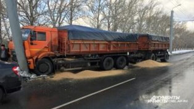 КамАЗ врезался в столб и рассыпал груз в Челябинске