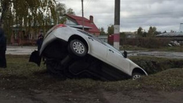 Chevrolet Lanos провалился в яму на Театральной площади в Ростове