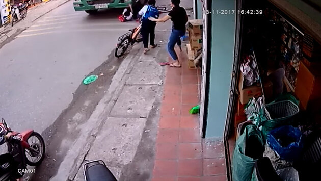 Как пишет новостной портал Mashable, видео, снятое камерой наблюдения на оживленной улице Ханоя, опубликовал канал ViralHog. Как видно на кадрах, школьник, потеряв равновесие, упал с велосипеда под колеса грузовика. К счастью, толстый рюкзак школьника, не дал парню перевернуться, и он остался на боку. Колеса машины проехала в сантиметрах от его головы и руки, раздавив рюкзак мальчика. Стоявшая рядом женщина, увидев падение ребенка, сумела его оттащить от грузовика, водитель которого даже не остановился.