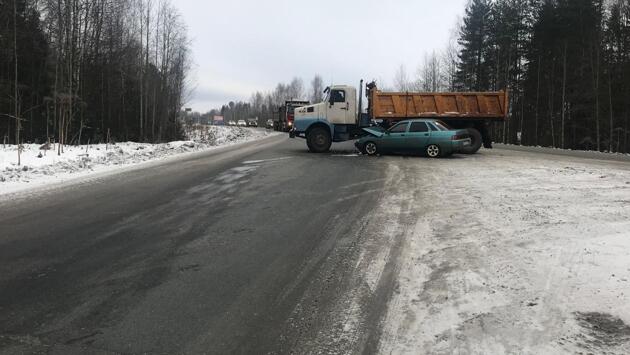 ДТП случилось утром 26.11.2017 года. На 13 километре автодороги Киров-Советск, по предварительным данным, 56-летний водитель грузового автомобиля «Вольво» при развороте столкнулся с попутным автомобилем «ВАЗ-2110». В результате ДТП получили травмы три пассажира автомобиля «ВАЗ-2110»: женщины 34 и 38 лет, а также девочка 7 лет. Фото — gtrk-vyatka.ru