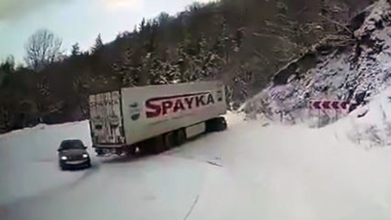 Фура чуть не устроила крупные неприятности сразу нескольким автомобилистам, но все завершилось неожиданно. В ролике два грузовика медленно едут по заснеженной дороге. Все идет относительно спокойно, пока не начинается поворот. Фура начинает тормозить, из-за чего огромный прицеп начинает заносить, в итоге, он развернулся на 90 градусов в тот момент, когда по встречной полосе ехали два автомобиля. Одному из них очень повезло, что все закончилось именно так. Читайте статью на QutoЧитайте также:Угнанный 27 лет назад Porsche случайно нашел собачникВидео: Электрокар против гепарда: кто когоВидео: Как машина куклы Барби переживет краш-тест