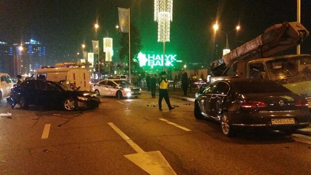 Двигаясь по проспекту Аль-Фараби, нарушая скоростной режим, водитель Toyota Camry (XV50) не заметил расставленные на дороге знаки, предупреждающие о ремонте, снес их, а затем врезался в стоящий самопогрузчик, с помощью которого украшали город. От сильного удара "легковушку" откинуло на полосу встречного движения, где она столкнулась с автомобилем Volkswagen Passat, который, в свою очередь, развернулся и задел тот же грузовик со стрелой. В результате аварии сильно пострадали пассажир и водитель Toyota Camry. Пассажира госпитализировали с различными травмами, а водителя — в крайне тяжелом состоянии. Автомобиль сильно дефомировало, с левой стороны отлетело колесо, почти полностью оторвался капот и выломало двери. На месте происшествия работают сотрудники криминальной и дорожной полиции.