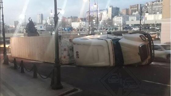 В понедельник, 4 декабря, во Владивостоке на пересечении улицы Светланской и Океанского проспекта большегруз завалился набок, перекрыв две полосы движения. Собралась внушительная пробка, сообщает PRIMPRESS. По информации vl_crime, у фуры лопнула рессора, после чего контейнер накренило и он упал набок. В результате ДТП никто не пострадал. По данным «Яндекс.Пробки» движение затруднено от остановки общественного транспорта «Цирк» до поворота на Океанский проспект.