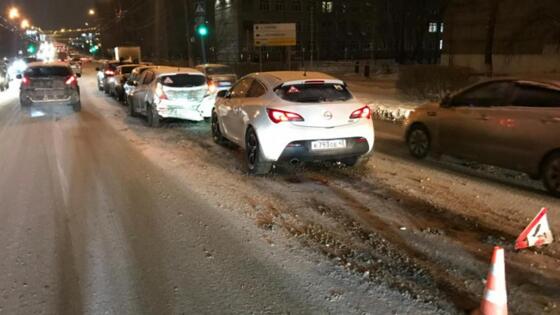 В среду, 13 декабря 2017 года, в Кирове на улице Воровского столкнулись пять машин. ДТП произошло в 18:50 в районе автосалона. «26-летний водитель Opel Astra пояснил, что поздно заметил остановившийся Hyundai Solaris, затормозил, но избежать столкновения не удалось. От удара Hyundai наехал на Mitsubishi Lancer, Mitsubishi въехал в «ВАЗ-2110», а «ВАЗ» – в Peugeot», – сообщили в ГИБДД по Кировской области. В отделе пропаганды безопасности дорожного движения ГИБДД по Кировской области сообщили, что у предполагаемого виновника ДТП, 26-летнего водителя Opel Astra, были признаки алкогольного опьянения. От прохождения медосвидетельствования на состояние опьянения мужчина отказался. Обстоятельства массового ДТП устанавливаются. За отказ от прохождения медосвидетельствования 26-летнему мужчине предстоит выплатить крупный штраф и попрощаться с водительским удостоверением минимум на полтора года. Фото – ГИБДД по Кировской области