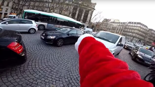 Лишь под угрозой оружия водитель автомобиля выходит из салона, и оказывается, что все это время за рулем была женщина. Все происходящее Санта-Клаус снимал на камеру, а видео уже распространяется на каналах в YouTube.
