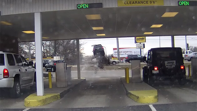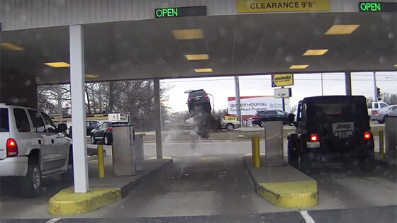 Водитель в американском городе Рокфорд вылетел на своем внедорожнике Kia Sorento на дорогу, перепрыгнув через насыпь и бордюр, и перелетел через стоящий на дороге автомобиль. Запись инцидента, сделанную на видеорегистратор, опубликовал на YouTube пользователь Robb Brilbeck. Лучшее автомобильное видео 2017 года Судя по координатам, обозначенным в видео, автомобиль находился около банкомата, в котором можно обналичить средства, не выходя из автомобиля. Простояв некоторое время около устройства, водитель открыл дверь, после чего автомобиль начал резко ускоряться и выехал на Ньюберг-роуд. В Jalopnik отмечают, что в результате случившегося никто не пострадал. Издание предполгает, что водитель ошибся, перепутав педали газа и тормоза. На это указывают, в частности, погасшие стоп-сигналы непосредственно перед ускорением.