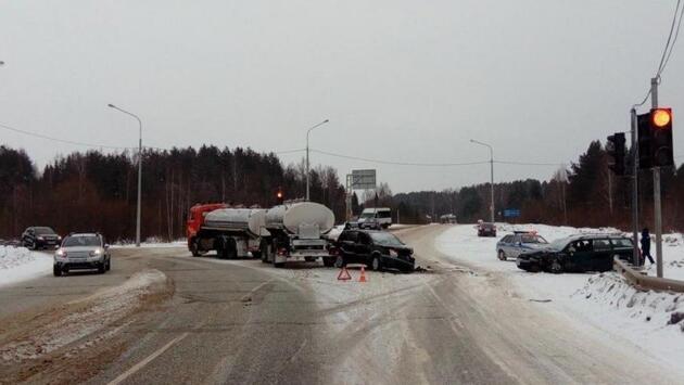 ДТП произошло вчера, 7 января, около 9:25 на 18-м км автодороги Киров – Малмыж – Вятские Поляны, в Кирово-Чепецком районе. По предварительным данным регионального УГИБДД, 31-летний водитель грузового автомобиля «КамАЗ-65115» с прицепом (мужчина, рабочий, трезвый) на регулируемом перекрёстке при повороте налево на разрешающий сигнал светофора не убедился в безопасности, не предоставил преимущество в движении автомобилю Ford Fusion, под управлением 45-летнего водителя, и совершил с ним столкновение. После чего транспортные средства отбросило на полосу встречного движения, где произошло столкновение с автомобилем Volkswagen Passat, под управлением 41-летнего водителя. Как сообщили в Госавтоинспекции, в результате происшествия водители легковых автомобилей, а также 2 пассажира автомобиля «Фольксваген Пассат» (женщины 38 и 32 лет) получили травмы (не госпитализированы). Фото – УГИБДД по Кировской области