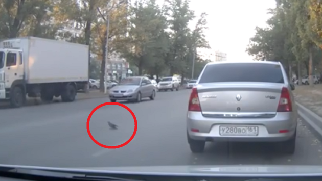 Причиной ДТП стало решение птицы пересечь оживленную проезжую часть. Смотрите, как сизокрылый не захотел взлететь, а стал спокойно переходить дорогу "пешком", и чем его прогулка в итоге закончилась.