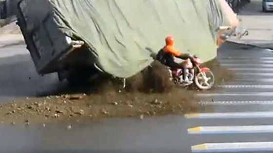 В китайской Юньнань мотоциклист продемонстрировал чудеса удачи после ДТП с грузовиком. Мужчина проезжал мимо груженой щебнем фуры в тот момент, когда машину занесло и она завалилась на бок. Несмотря на очень близкую дистанцию, мотоциклист не только не пострадал, но даже сохранил транспортное средство. Читайте статью на QutoЧитайте также:Видео: Владелец Tesla рассказал, как использовать апельсин в электрокареВидео: Audi R8 отправил внедорожник Nissan в полетВидео: Женщина помыла автомобиль бензином на заправке