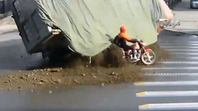 Видео: Полный кузов щебня чуть не настиг мотоциклиста