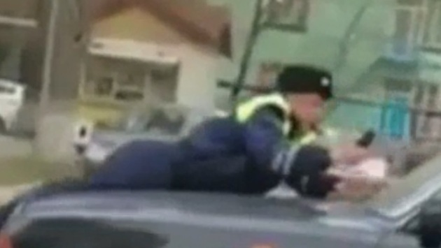 Инцидент произошел в Махачкале. На видео, снятом очевидцами и опубликованном в соцсетях, видно, как сотрудник ГИБДД буквально распластался на капоте движущейся черной "Волги", однако не прекратил снимать нарушителя на мобильный телефон. Сообщается, что мужчина по пока неустановленной причине решил не останавливаться по требованию гаишника и скрыться. Личность водителя уже установлена, мужчина объявлен в розыск.