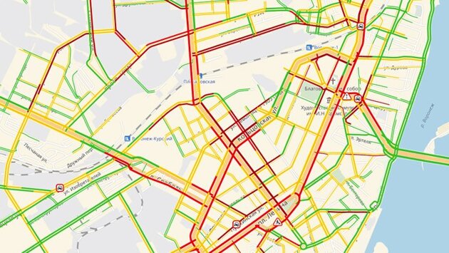 Сервис «Яндекс. Пробки» оценивает ситуацию на дорогах в 8 баллов. Сегодня, 30 января, Воронеж вновь сковали многокилометровые пробки. Особенно сложная ситуация образовалась в центре города, где из-за неисправного светофора с японской системой на площади Заставы парализовано движение вдоль улицы Плехановской и Московского проспекта. Как пояснили «Вести-Воронеж» в мэрии, там в курсе этой проблемы. Причиной отключения светофора стали перебои в подаче электричества на участке. Правда, когда электроснабжение восстановится – пока неизвестно. Кроме того, ухудшению общей ситуации на дорогах города способствует погода. На большинстве центральных улиц: Плехановской, Кольцовской, проспекте Революции скорость движения авто не превышает 3 – 7 км/ч. Затруднено движение и на развязке на улице 9 Января.