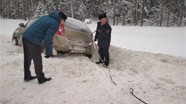 Полицейские, став очевидцами ДТП в Вологодской области, помогли вызволить автомашину из снежного плена