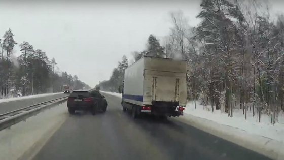 Лихач на BMW отправил в кювет грузовик на трассе в Подмосковье