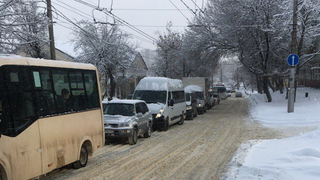 Первый день рабочей недели в Калуге начался с дорожного коллапса, который стал одним из последствий продолжавшегося более суток снегопада. Снежная каша на проезжей части, а также два ДТП, одно из которых произошло на гагаринской развязке на левом берегу, а второй – на Тульском шоссе на правом, практически полностью парализовано движение в обе стороны на отрезке от сквера Мира до Тульского шоссе. Фото Д.Добровольского Согласно данным сервиса «Яндекс Пробки», машины на этом отрезке ползут со скоростью 5-7 километров в час. Такая же ситуация на Киевке. Очень сложная обстановка и на улице Маршала Жукова. По словам очевидцев, троллейбусы не могут въехать в горку, маршрутные такси разворачиваются и едут к центру через Баррикад. Водители легковушек преодолевают подъем, толкая свои машины. Затруднено движение на отдельных участках Московской улицы, на Тарутинской, встала даже улица Чапаева. Фото Only Well